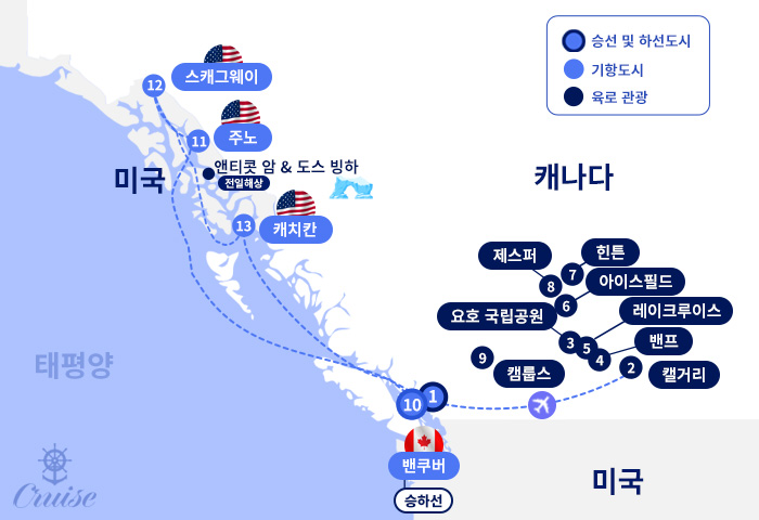 [도시 안내] ▶ 캐나다에서 세 번째로 큰 도시이자 아름다운 해안도시 밴쿠버 관광▶ 캐나다 알버타에 있는 로키 산맥의 국립공원 재스퍼 국립공원 관광▶ 세계 10대 절경의 호수 레이크루이스 관광▶ 죽기 전에 가봐야할 곳으로 손꼽히는 도시 밴프 관광▶ 알래스카의 주도 주노 관광▶ 골드러시의 추억을 간직한 도시 스캐그웨이 관광▶ 세계문화유산으로 지정된 경이로운 글레이셔베이 국립공원 빙하 관람▶ 자연의 아름다움을 간직한 도시 알래스카 캐치칸 관광